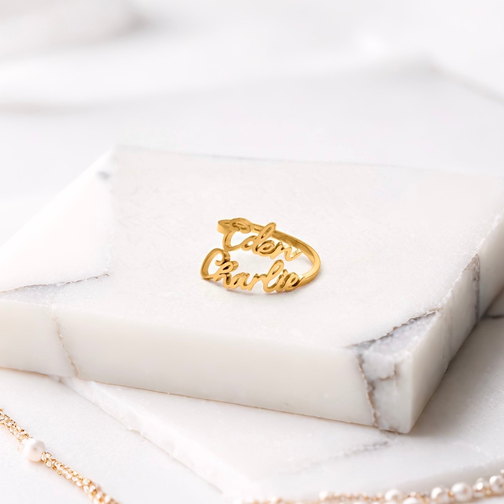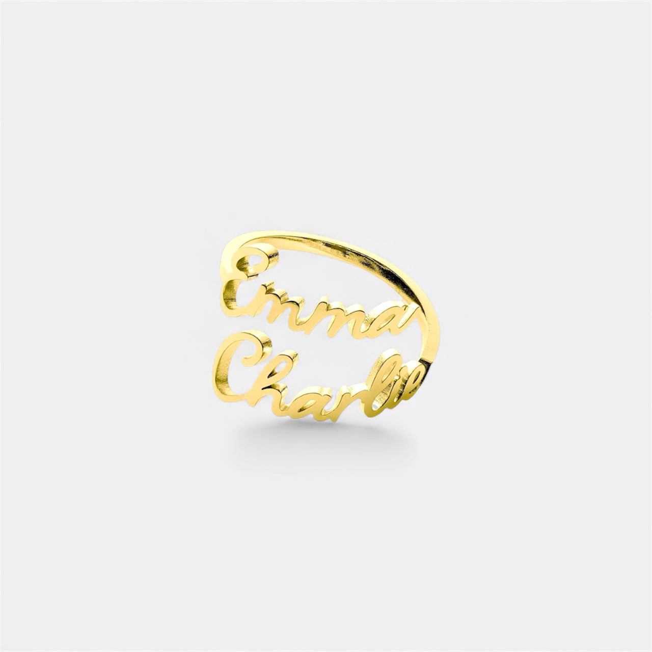 精細切割的字母配上柔和弧形戒圈,線條流暢立體。訂製專屬名字組合,營造層次與個人風格。