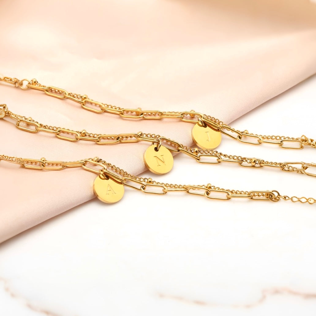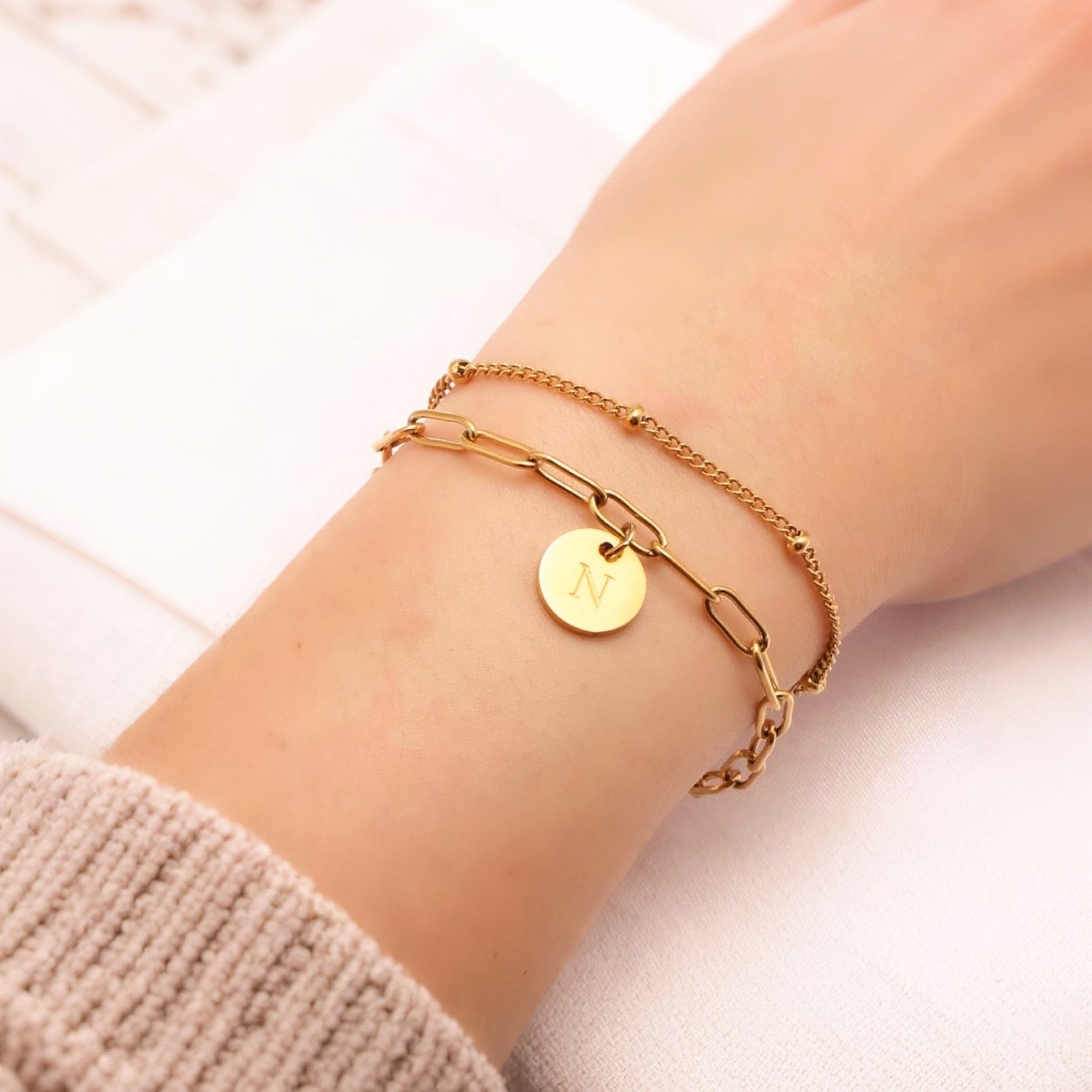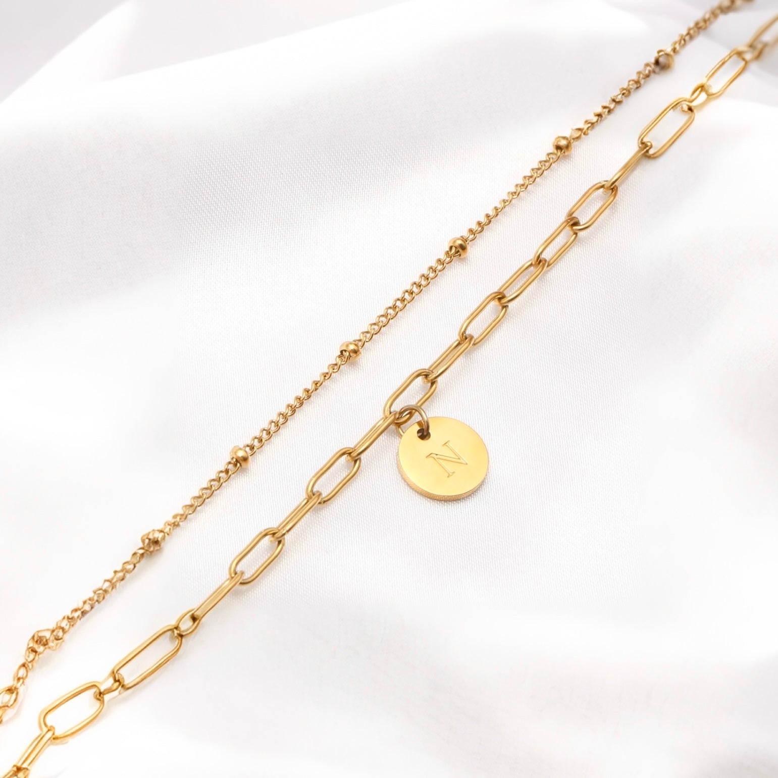 粗幼雙鏈一體式設計,小圓珠細鏈搭配回形針鏈條,輕鬆營造層次感。配上字母刻印圓牌,小巧精緻,適合日常佩戴。